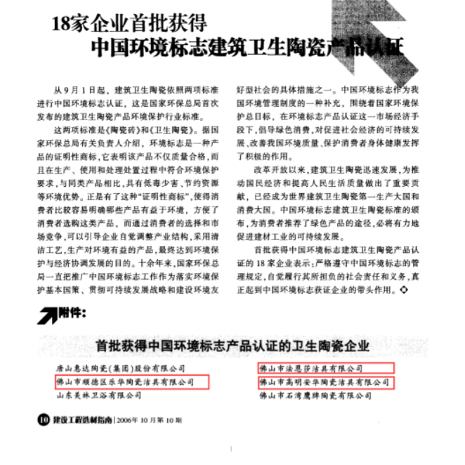 *2006年,,,,,,,,18家企业首批获得中国情形标记修建卫生陶瓷产品认证,,,,,,,,其中豪运国际welcome家居集团包办3个名额
