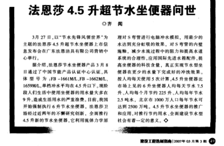 *2007年,,,,,,,,法恩莎4.5升超节水座便器问世,,,,,,,,远远达超国家节水产品6升的标准